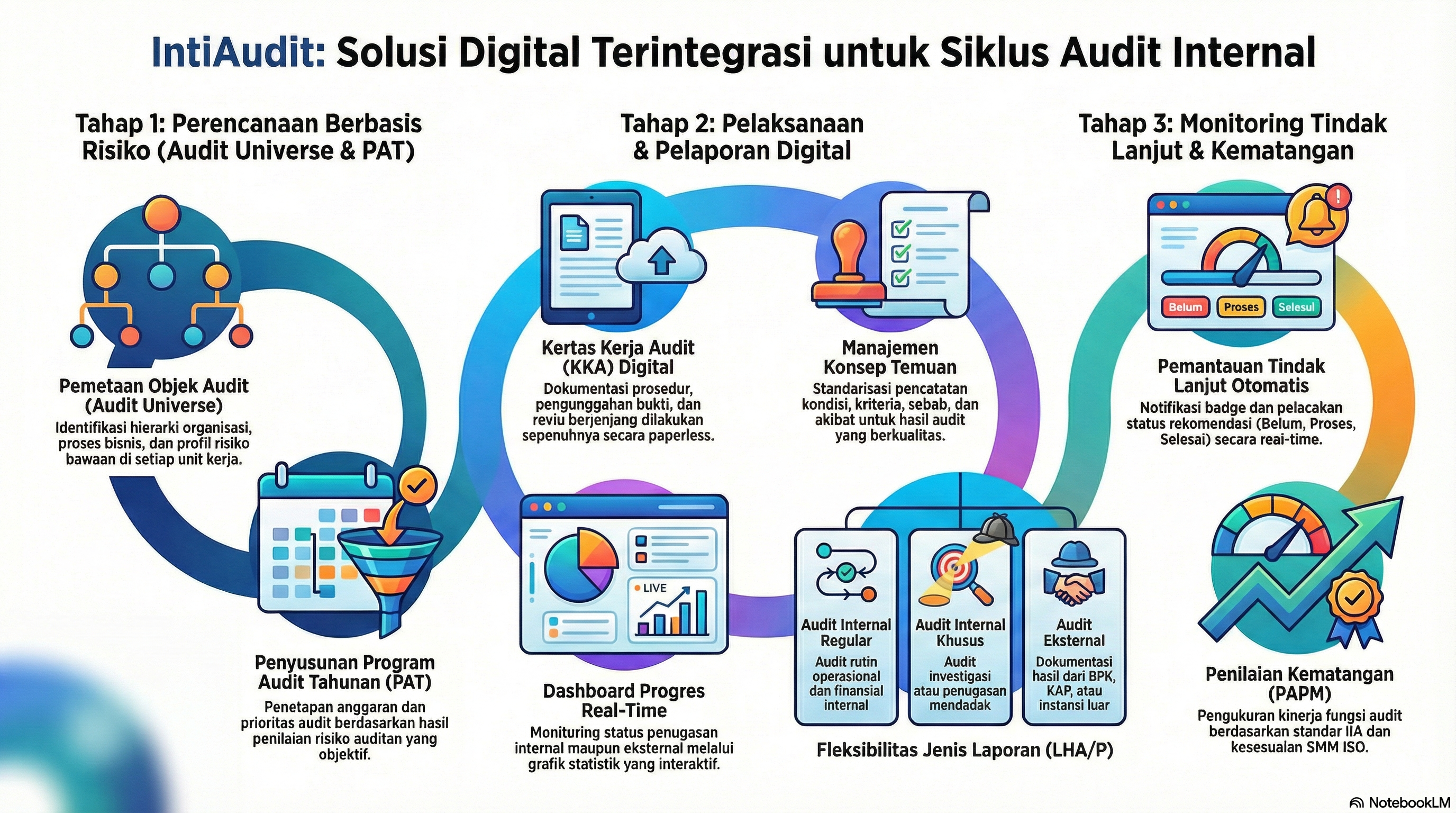 IntiAudit mengawal seluruh proses audit dari perencanaan hingga penutupan rekomendasi.